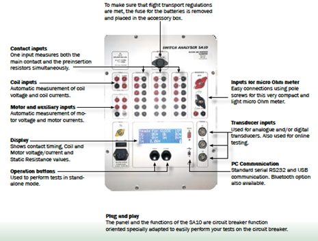 It has a built-in micro Ohm meter/Ductor for measuring of static and dynamic resistance of the breaker poles. It only weighs 11,6 kg. The versatility and precision that this unit offers is, without question unchallenged, and it will indeed be your best partner when testing circuit breakers. Tests in areas with high induction at known problematic substations has proven the SA10A to be the only circuit breaker timer that could withstand these extreme conditions. It's rugged, it's small and highly appreciated by our customers.